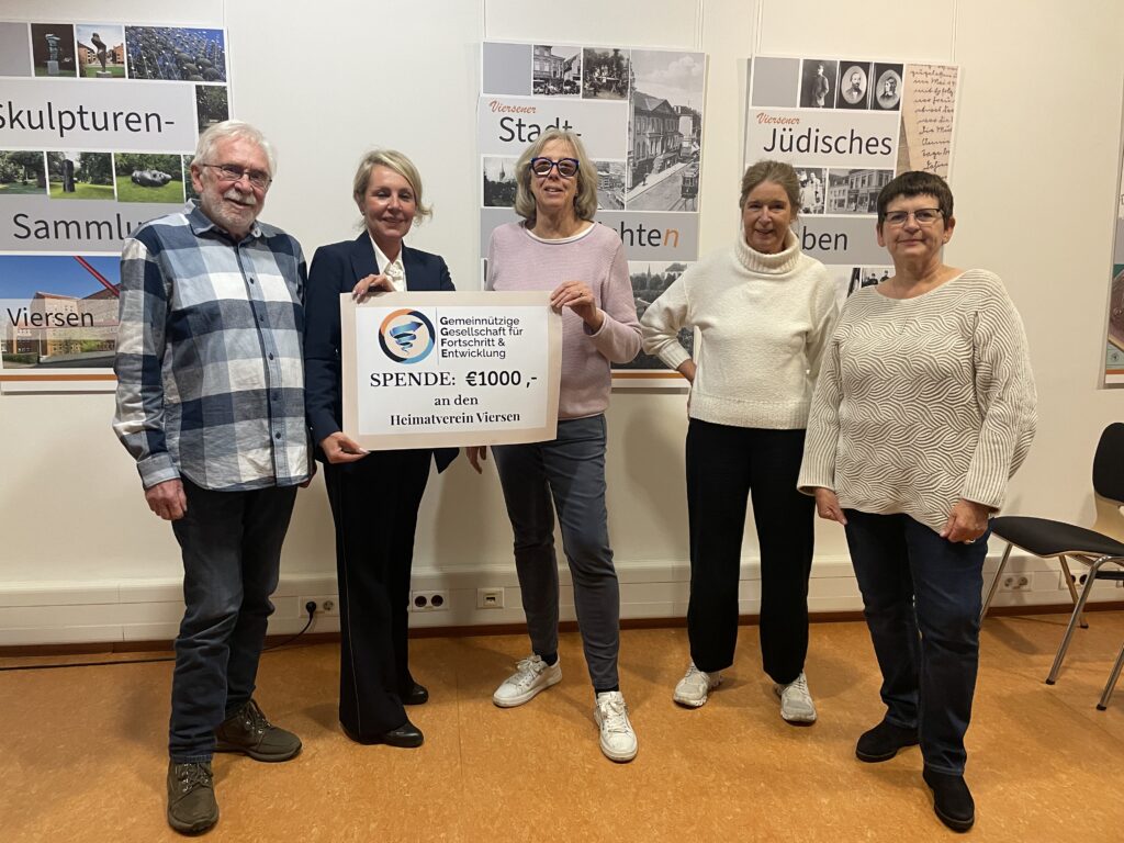 Gefreut haben wir uns gestern über eine Spende über 1000 Euro der GGFE: Gemeinnützige Gesellschaft für Fortschritt und Entwicklung. Zur Überreichung durften wir die stellvertretende Geschäftsführerin Irina Wirtz-Ioannidis (2.v links) bei uns begrüßen und ihr unsere Räumlichkeiten zeigen. Empfangen wurde die Spende von den Mitgliedern des Vorstands des Viersener Heimatvereins Willi Korn, Beatrix Wolters, Sigrid Eley und Jutta Pitzen.