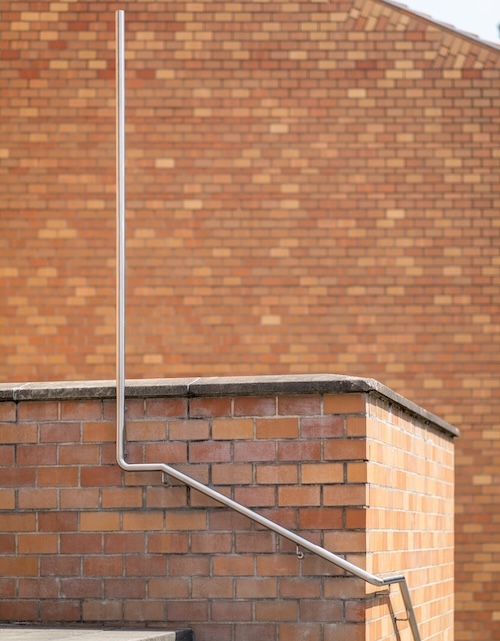 Die technisch präzise ausgeführte Verlängerung verstärkt den Eindruck, dass der gesetzlich vorgeschriebene Handlauf und dessen Fortsetzung wie aus einem Guss entstanden sind. Es handelt sich um die „Antenne Viersen“, eine skulpturale Intervention der Bildhauer Maik und Dirk Löbbert. Seit 2018 irritiert diese Edelstahlstange die Passantinnen und Passanten, zumindest jene, die sie überhaupt wahrnehmen, und verwandelt einen alltäglich, meist unbeachteten Gegenstand in ein Kunstobjekt. Die Bildhauer Maik und Dirk Löbbert verbinden in ihren Projekten Kunst und Alltag im öffentlichen Raum. Die Objekte sind immer auf den Ort, an dem sie installiert sind, bezogen. Sie greifen die vorhandene Situation auf, entwickeln sie weiter – oft durch minimale Eingriffe – und verändern sie dadurch. Hätte es an dieser Stelle keinen Handlauf gegeben, hätten sie dort keine Kunst gemacht, so die Bildhauer. „Die Skulpturen sollen die Wahrnehmung irritieren und unterbrechen“, lautet ihr künstlerisches Prinzip. Die „Antenne Viersen“ nennen sie daher auch „Irritationsstange“.