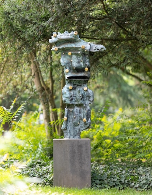 Mattas „Chaosmos“ präsentiert sich dem Betrachter und der Betrachterin auf seinem Sockel auf Augenhöhe. Unvermittelt stellt sich dabei die Frage nach den Augen, denn deren Anordnung an der Skulptur ist uneindeutig. Dutzende von goldenen knopfartigen Augen, in denen allerdings wiederum kleine Gesichter zu erkennen sind, überziehen die Figur. Sitzen unter und über dem froschartig breit gezogenen Mund, kleben an der stummelförmigen Nase, verteilen sich leuchtend über die gesamte Form. Eine Form, die zu beschreiben fast ein Ding der Unmöglichkeit ist: Sie weicht zur Seite aus, um wieder in die Achse zurückzukehren und im oberen Teil Überhänge zu bilden; sie ist geprägt von Ausbeulungen und Verwerfungen. Die Figur, fast schon müßig zu erwähnen, dass auch hier ein Umhergehen notwendig ist, da der Eindruck in rascher Folge wechselt, scheint überwiegend aus einem übergroßen Kopf zu bestehen. Da sind dann noch Ärmchen und zusammengewachsene Beine angesetzt. Nichts scheint in Proportion und Maß stimmig zu sein. So entsteht der Eindruck eines Wesens zwischen Mensch und Tier, zwischen Mensch und Fabelgestalt – eher Monster als Mensch, wenn man ein Fazit ziehen möchte.