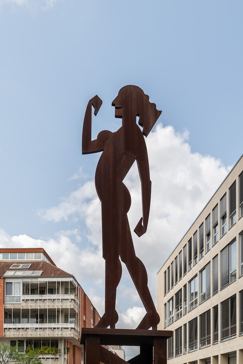 In unmittelbarer Nähe zum politischen Zentrum der Stadt Viersen, genauer gesagt an der Seite des Stadthauses mit dem Büro des Bürgermeisters, erhebt sich die „Frau mit Armen“ des Künstlers Georg Ettl. (Bald wurde für sie der Name „Starke Frau“ geläufig.) Das höchste Amt der Stadt war über viele Jahre hinweg von Frauen besetzt. Wenige individuelle Details gibt die Skulptur von sich preis und ist dennoch eine überzeugende Erscheinung. Die knapp fünf Meter hohe Silhouette einer Frau wurde per Laser aus Corten-Stahl ausgeschnitten. Die Figur ist allein durch den Titel als Frau zu identifizieren; lange Haare und Stöckelschuhe sind längst nicht mehr eindeutige Merkmale oder Accessoires einer Frau. In einer extrem aufrechten Haltung ist sie im Begriff voranzuschreiten, den rechten Arm hält sie am Körper nach hinten, den linken hebt sie an und spannt ihn so an, dass der Bizeps deutlich anschwillt. Der Mund ist leicht geöffnet. Ihre Größe wird durch ihre Position auf einem Podest zusätzlich betont. Der Sockel hat in der Kunstgeschichte eine wechselnde Funktion erlebt. Mal diente er der Stabilisierung, mal dem Schutz, mal der Überhöhung der gezeigten Person. Für die starke Frau von Georg Ettl ist das 240 Zentimeter hohe Podest unverzichtbar, betont es doch die Stärke, Kraft, Größe und Durchsetzungsfähigkeit der Frau. Es scheint, als sei sie auf ein Podest gestiegen, um einer großen Menschenmenge mitzuteilen, was sie zu sagen hat. Vielleicht wird auch „der Frau an sich“ ein Denkmal gesetzt?