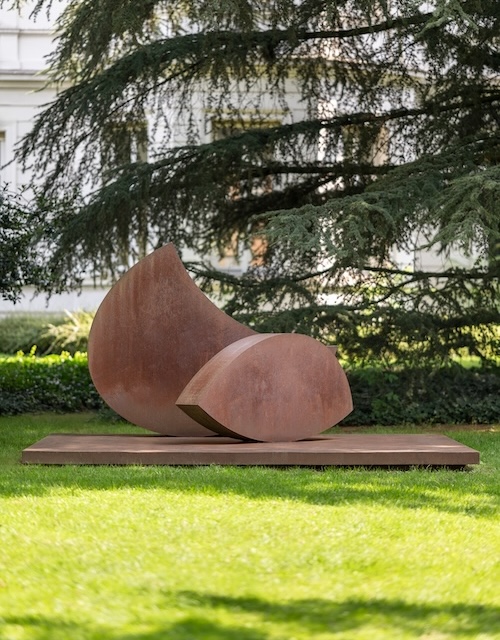 Es geht um das Nachdenken über Veränderung. So, wie die zweiteilige Stahlblechskulptur von Wolfgang Nestler auf der Plinthe liegt, fordert sie die Betrachtenden auf, sie in ihrer Vorstellung neu zu positionieren. Wie könnten die beiden Teile zueinander angeordnet sein? Was würde sich dadurch ändern? Wäre es möglich, sie zusammenzufügen und ein harmonisches Ganzes zu formen? Wie veränderte sich ihre Wirkung, wenn beide ellipsenförmigen Elemente der Skulptur flach auf der Grundplatte auflägen?